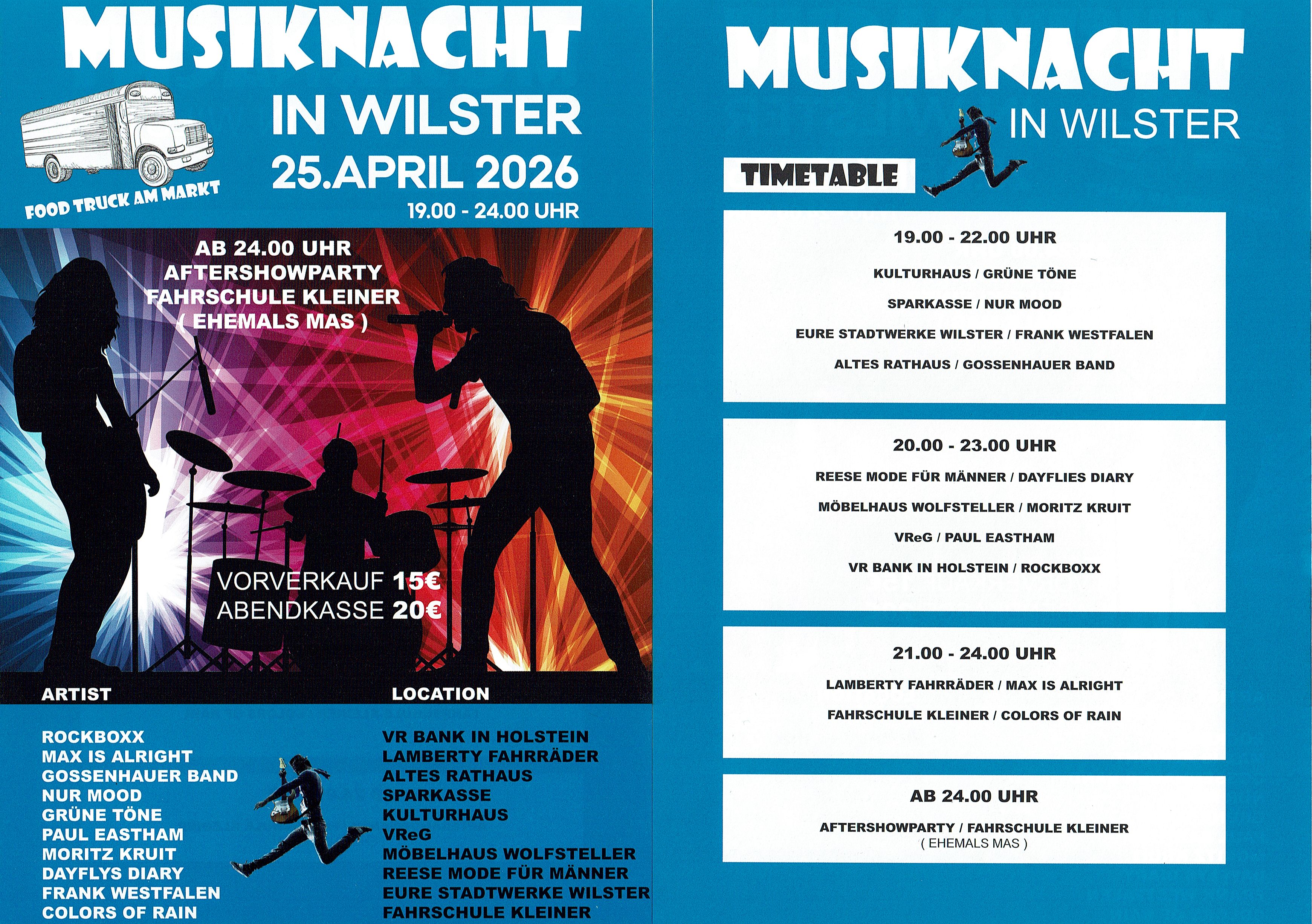 Der Itzehoer Musiker Moritz Kruit tritt beim Möbelhaus Wolfsteller auf, Paul Eastham aus Dänemark bei der Volksbank Raiffeisenbank, Am Markt 23; die Gossenhauer Band aus Hamburg tritt im Alten Rathaus auf und RockBoxx aus Itzehoe spielt in der VR-Bank Holstein, Am Markt 20–21. Max is Alright gibt es bei Fahrrad Lamberti zu hören, No Mood spielt in der Sparkasse Westholstein. Im Kulturhaus erklingen „Grüne Töne“. Die Wilsteraner Prog-Rock-Formation Dayflys Diary tritt beim Modehaus Reese auf, Frank Westphalen im Gebäude der Stadtwerke und Colors of Rain spielen in der Fahrschule Kleiner.